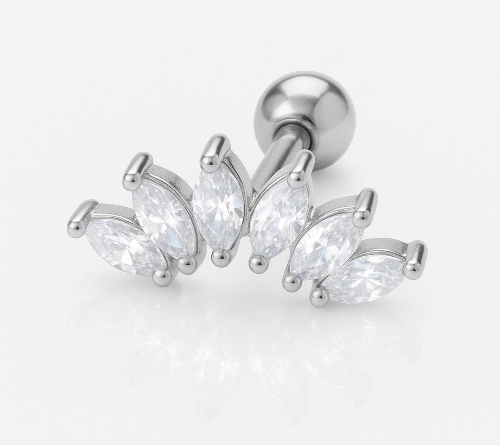 Perfetto per piercing helix, flat, conch e altri tipi di fori sulla cartilagine. Piercing per cartilagine in acciaio inox dorato con zirconi. Il design presenta sei zirconi taglio marquise, disposti in modo armonioso per creare un effetto brillante.Il sistema di chiusura è a pallina avvitabile, pratica e sicura per un utilizzo quotidiano.In dotazione sono incluse anche chiusure in plastica trasparente