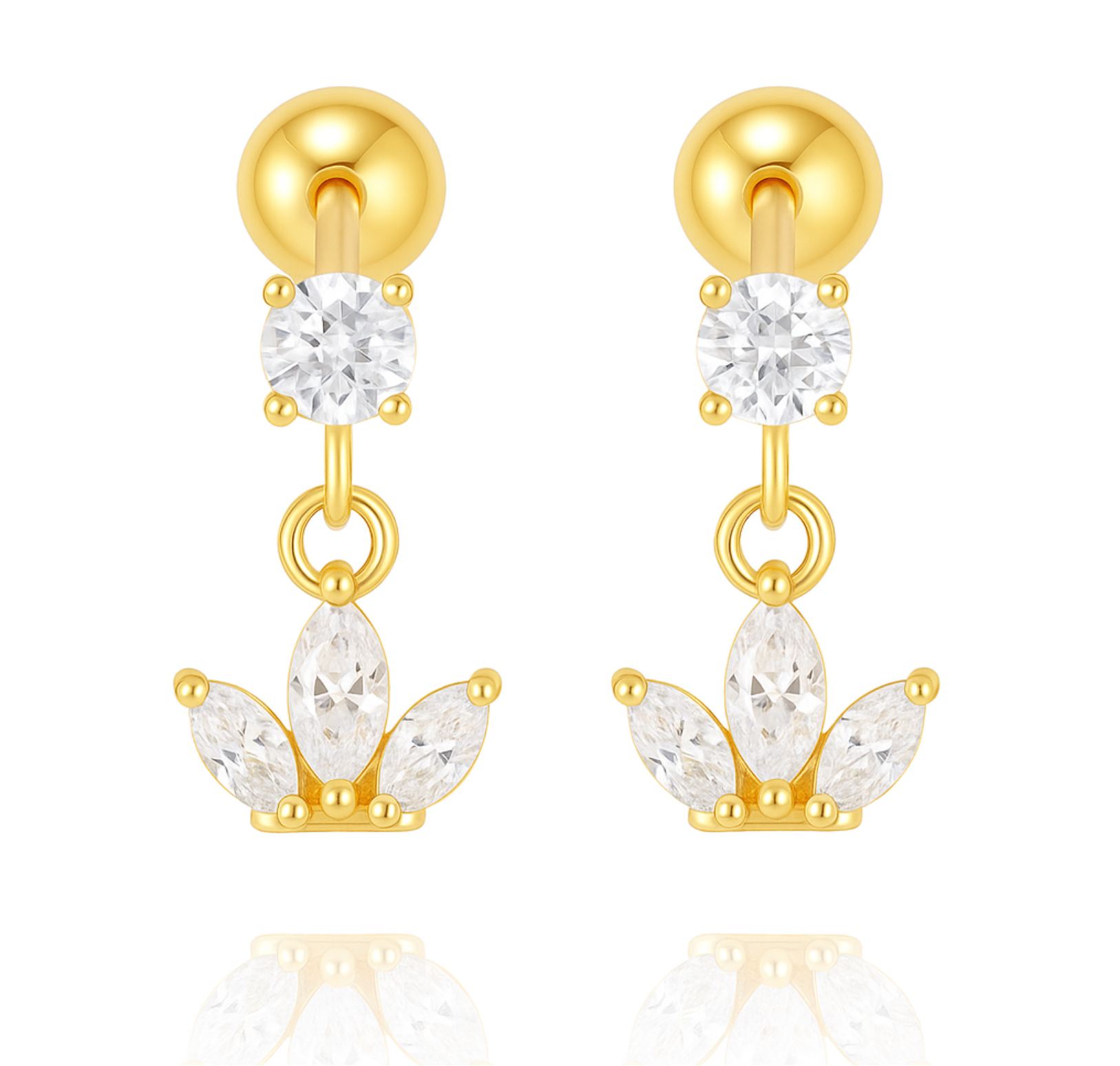 Il design presenta una brillante composizione a corona, formata da tre zirconi taglio marquise, pendenti da uno zircone centrale tondo incastonato sulla parte superiore.Materiali: finitura dorata, barra in acciaio inossidabile Chiusura: pallina avvitabile, sicura e comodaQuantità: coppia (2 pezzi)Perfetti per lobi o cartilagine