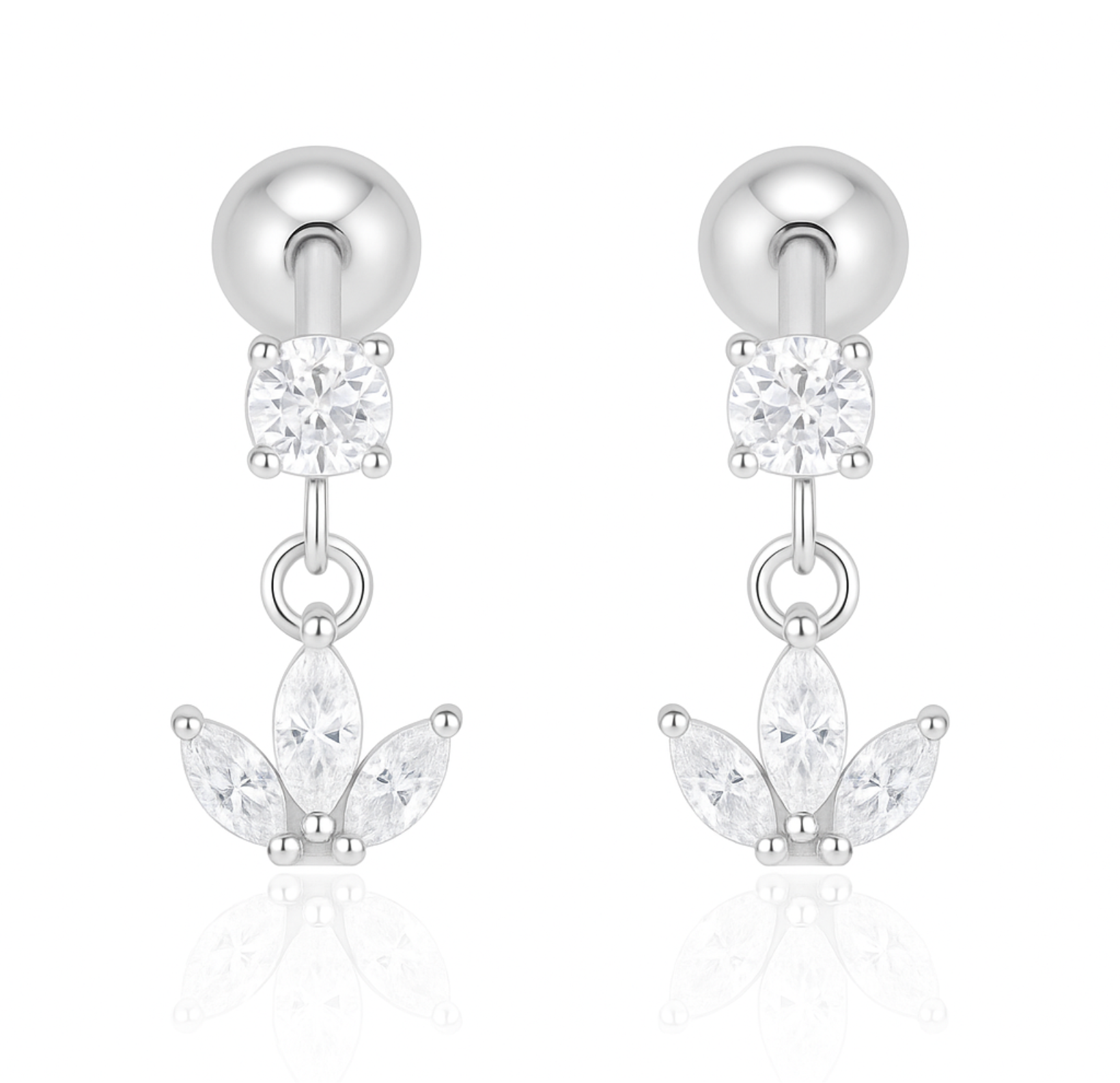 design presenta una brillante composizione a corona, formata da 3 zirconi taglio marquise, pendenti da uno zircone centrale tondo incastonato sulla parte superiore.Materiali: finitura dorata, barra in acciaio inossidabile Chiusura: pallina avvitabile, sicura e comodaQuantità: coppia (2 pezzi)Perfetti per lobi o cartilagine
