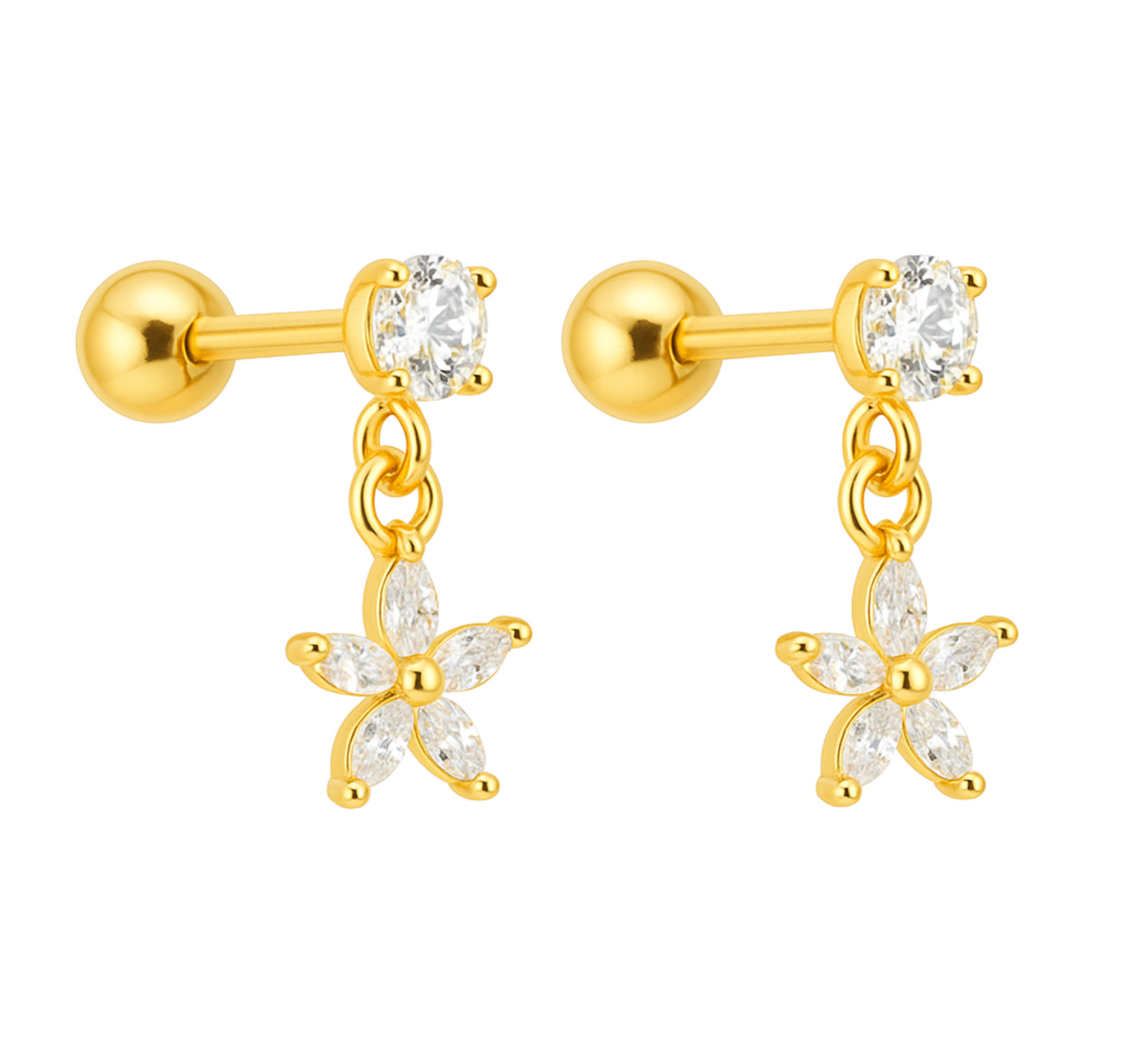 design presenta una brillante composizione a fiore, formata da cinque zirconi taglio marquise, pendenti da uno zircone centrale tondo incastonato sulla parte superiore.Materiali: finitura dorata, barra in acciaio inossidabile Chiusura: pallina avvitabile, sicura e comodaQuantità: coppia (2 pezzi)Perfetti per lobi o cartilagine
